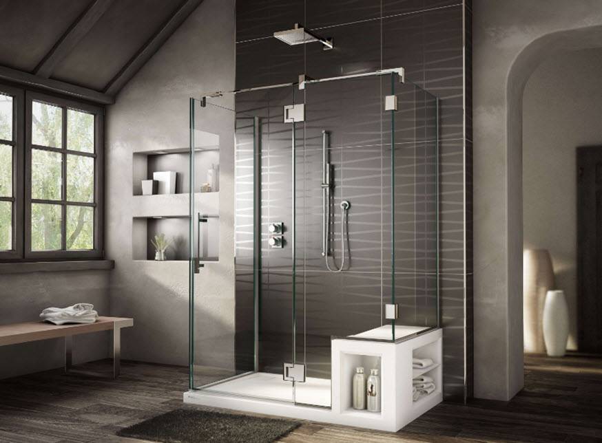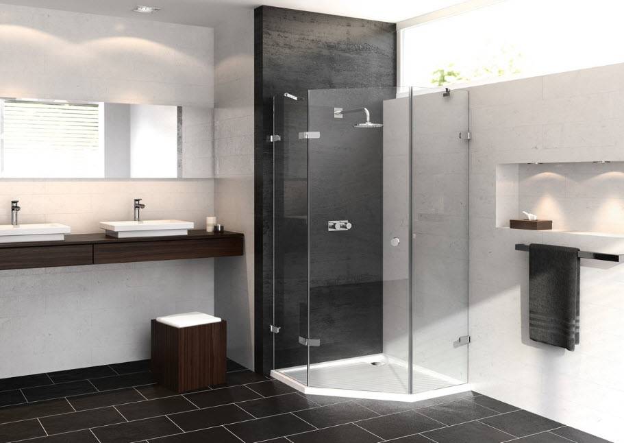 Самым ценным преимуществом решения — душа без поддона — является свобода выбора формы кабины. В зависимости от объема и типа помещения кабина может быть треугольной, квадратной и прямоугольной. Также бывают разные типы дверей — они бывают раздвижные, распашные и т.д.