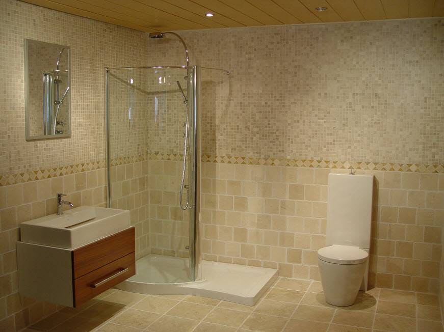 Отделочные материалы ванной комнаты могут быть самыми разнообразными. В зависимости от размеров конкретного помещения пространство душевой кабины отделывается стеновыми и потолочными пластиковыми панелями, плиткой, мозаикой. Пол оформляют плиткой либо керамогранитом. В деревянном доме его оформляют доской.