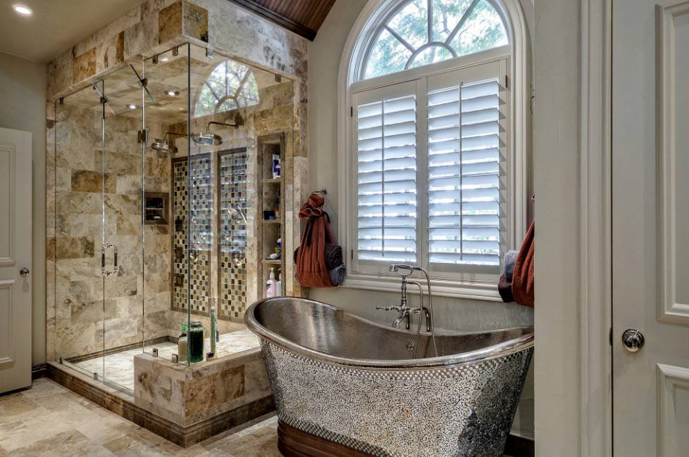 Классический стиль – прекрасное решение для больших помещений, где можно обустроить не только душевую кабинку, но и стильную ванну. Если стиль реализуется в небольшой ванной комнате, то нужно уменьшить количество декоративных предметов, сделав акцент на светлой цветовой гамме. Классический стиль – это роскошь и благородство, сдержанность и мягкие пастельные тона. Для отделки лучше всего использовать штукатурку, стекло, дерево и камень, плитку (кафель или керамогранит).