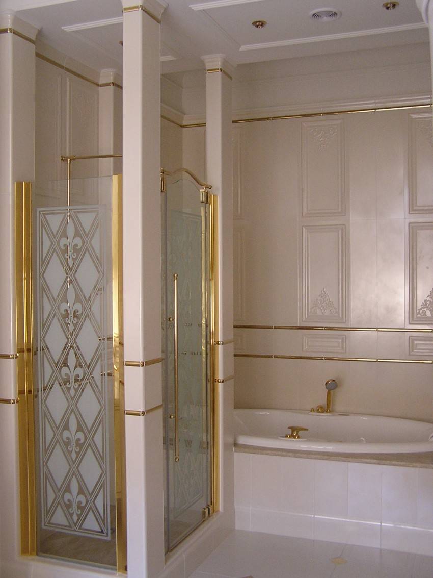 Что касается цвета кабин, то его выбирают с учетом фонового оформления стеновых и потолочных перекрытий. Например, на фоне бежево-серой стены отлично смотрится кабина с затемненными стеклами и темным каркасом. При этом по желанию можно подобрать не только белый, но и темный цвет поддона. В зависимости от интерьерного дизайна стекла кабины могут быть не только прозрачными, но и окрашенными и даже витражными.