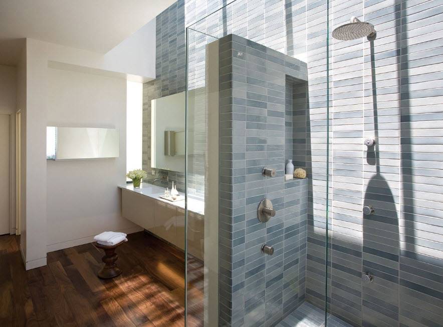 Оставшиеся стены отделывают плиткой. У таких душевых кабин нет верхней крышки, поэтому здесь нет тропического душа. Душ может быть с поддоном и без него: иногда дизайн нуждается в монолитной конструкции в виде площадки с противоскользящей облицовкой.