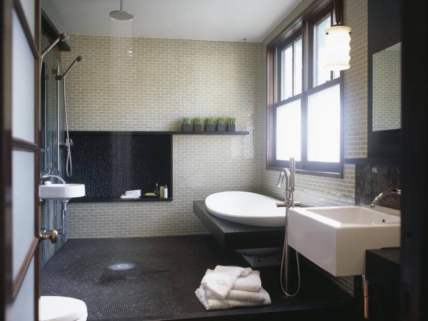 - минимализм – встроенные в стенку, практически незаметные смесители, прозрачные дверцы из закаленного стекла, хорошее освещение, однотонная напольная плитка;