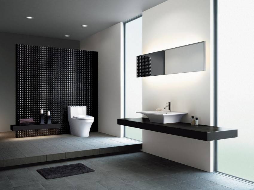 Для стиля хай-тек характерно использование сдержанной цветовой гаммы, прямых линий, новейших моделей сантехники. Разбавить простоту стиля поможет необычная система освещения.
