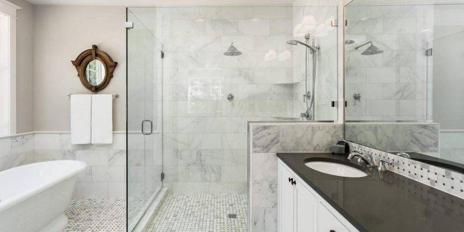 Идеальным вариантом душевой в классическом помещении станет одна перегородка из стекла с мраморной отделкой стен.