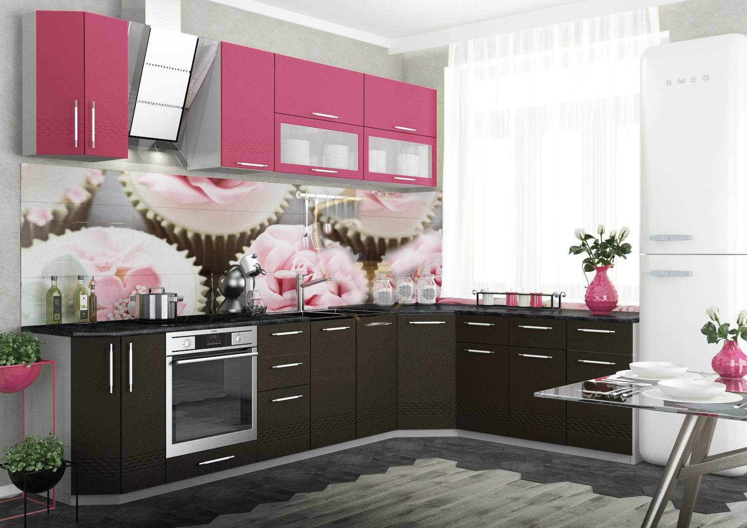 Традиционное сочетание на кухне: цвет фуксии с белым. Благодаря чистоте белого, пурпурный раскрывается, становится глубже и интереснее. С ним сочетаются все оттенки фуксии, от самых мягких до броских и насыщенных.