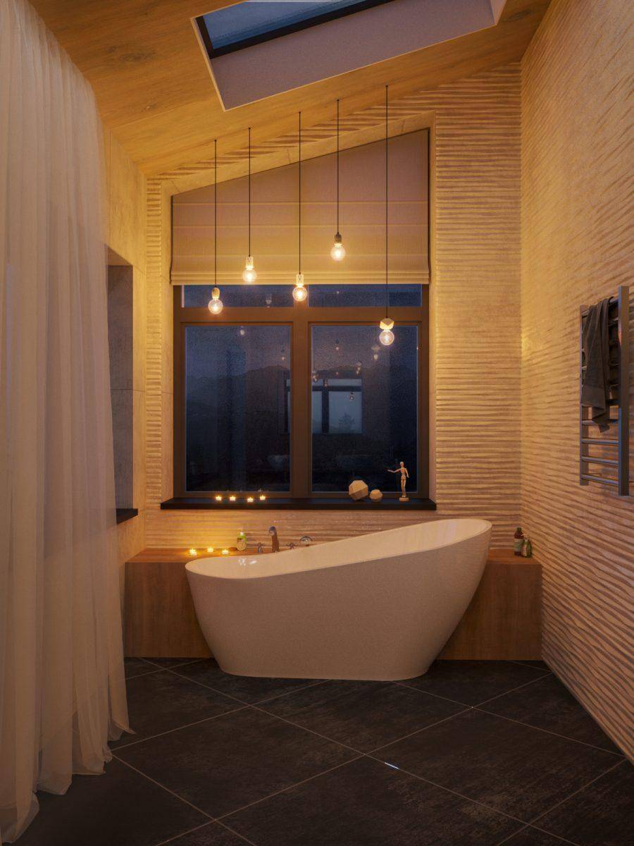- ванна размещается в центре или отделывается деревянными панелями;