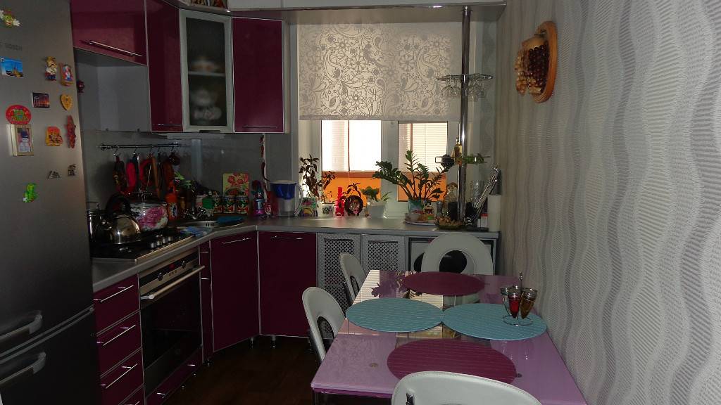 Неплохо смотрятся комнаты, оформленные в коричневом цвете с ярким пурпурным гарнитуром. Если последний сделать матовым, с приглушенными тонами, то интерьер вполне подойдет для кухни в классическом стиле.