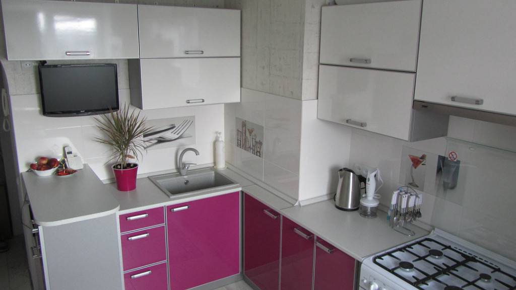 Подобную кухню можно оформить практически в любом стиле интерьера: от классического до хай-тека, если выбрать подходящие тона. Эффектный прием — комбинация белых шкафчиков и нижних ящиков цвета фуксии. Таким образом кухня выглядит гармонично и, как ни странно, визуально становится выше и просторнее.