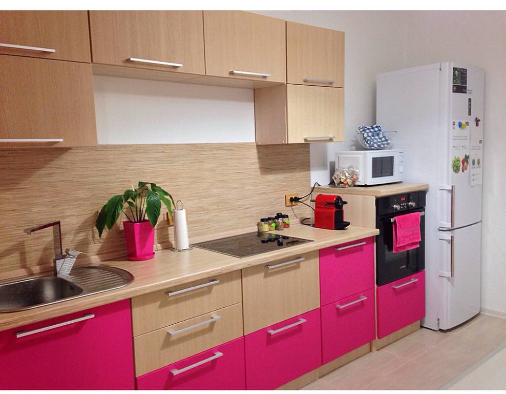 Если вы хотите создать изысканный и мягкий, уютный интерьер, сочетайте насыщенные оттенки фуксии с кофейным, темно-бежевым. Необходимо слегка осветлить кухню? Выбирайте светлый беж песочных и кремовых тонов.