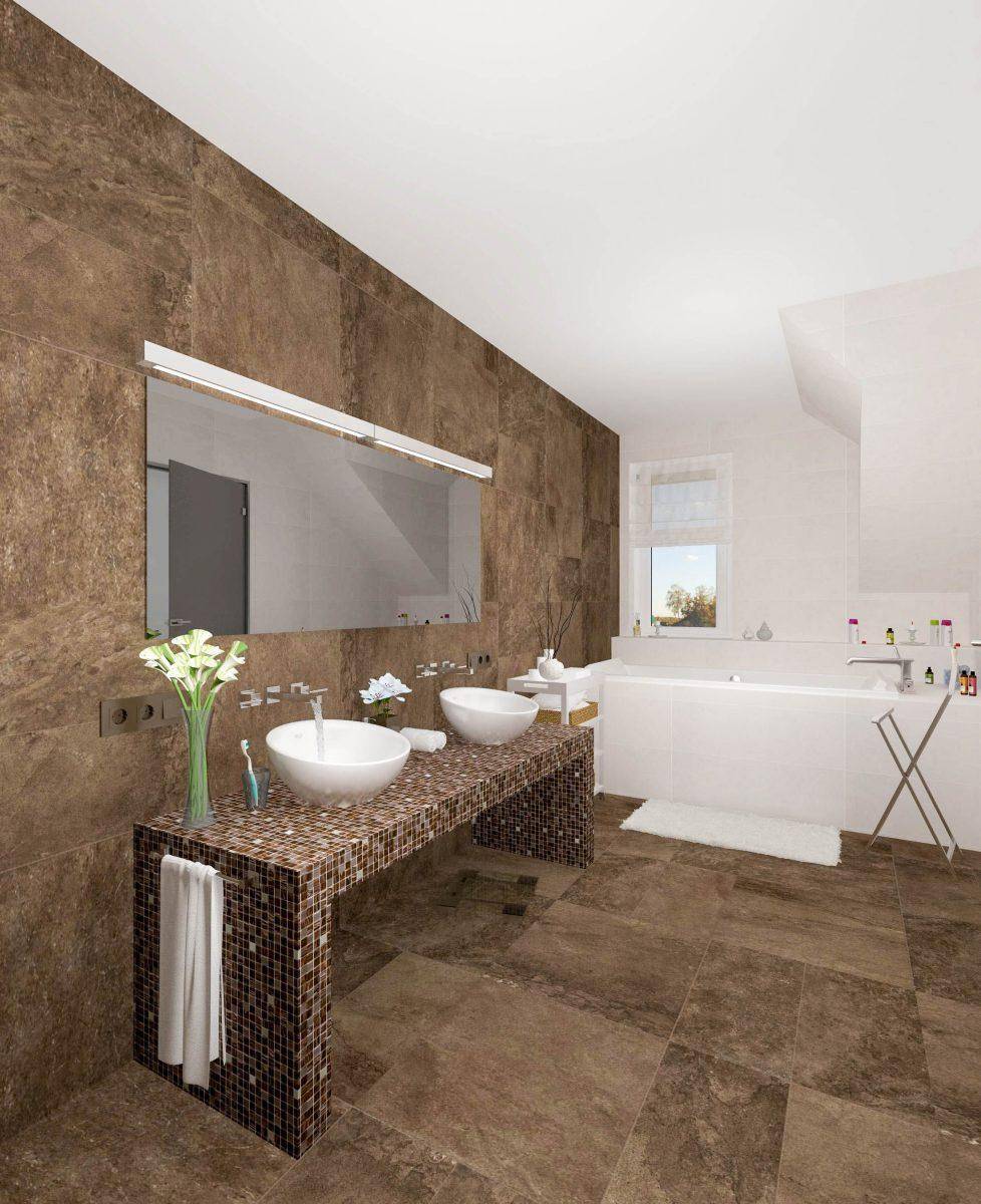 Чтобы избежать эффекта монотонности в облике ванной комнаты, используют распространенный прием облицовки стен плитами из природного камня с полированной и матовой поверхностью.