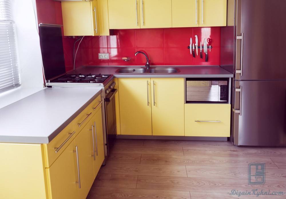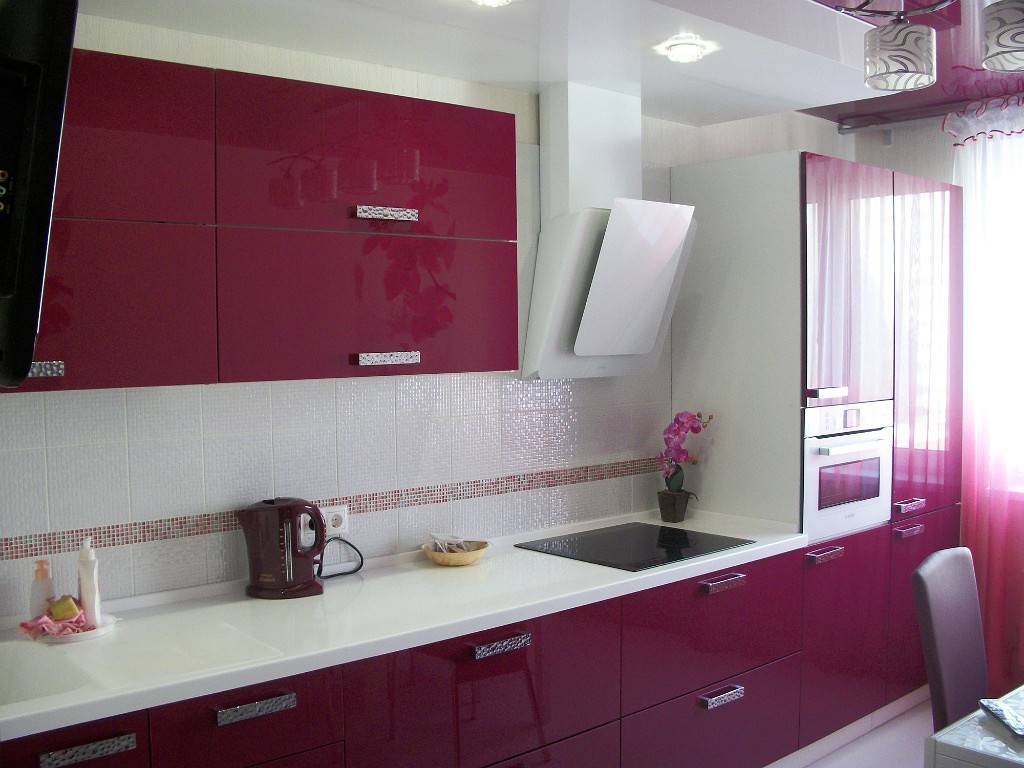 Подобную кухню можно оформить практически в любом стиле интерьера: от классического до хай-тека, если выбрать подходящие тона. Эффектный прием — комбинация белых шкафчиков и нижних ящиков цвета фуксии. Таким образом кухня выглядит гармонично и, как ни странно, визуально становится выше и просторнее.