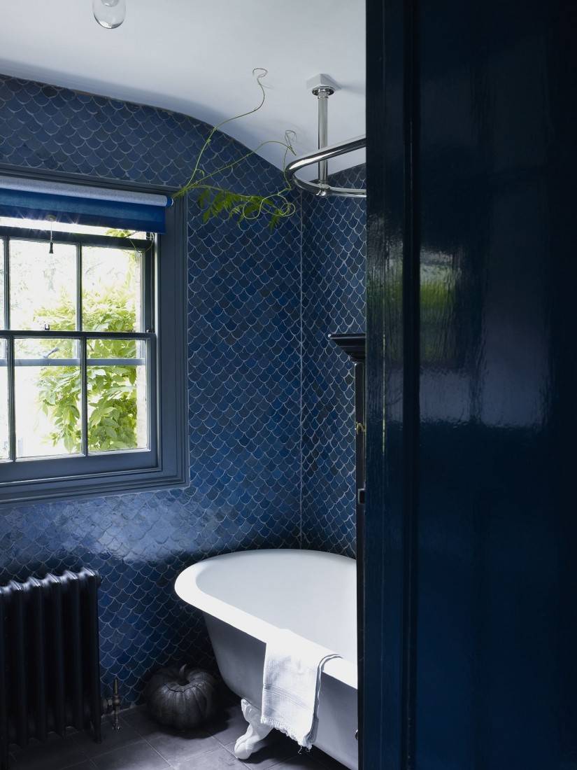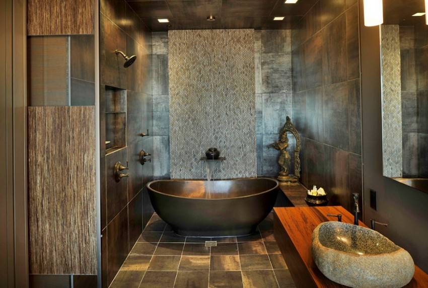 Дополнит эффект фактурность материалов. К тому же шероховатая плитка не даст скользить ногам.