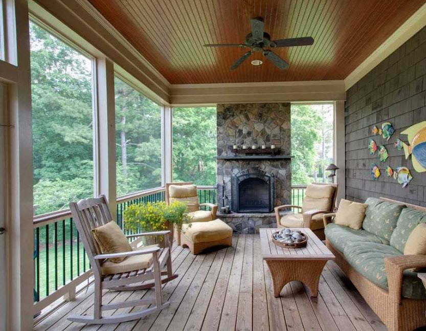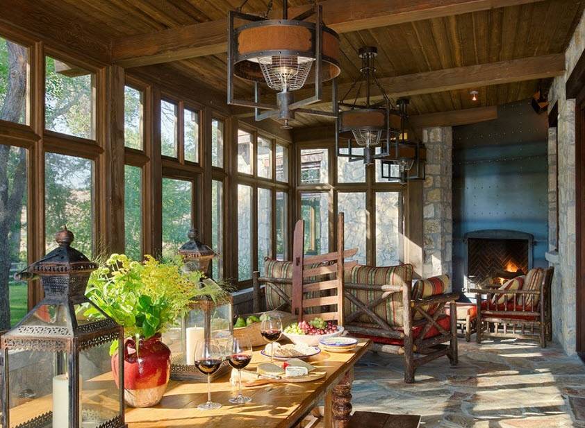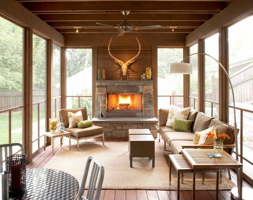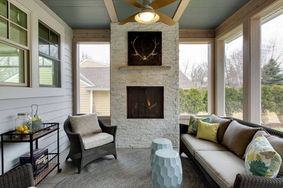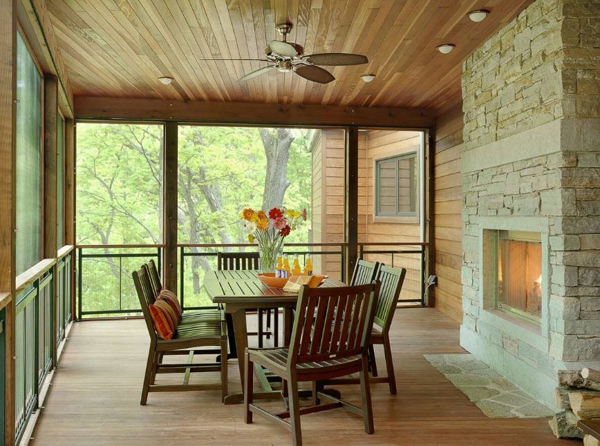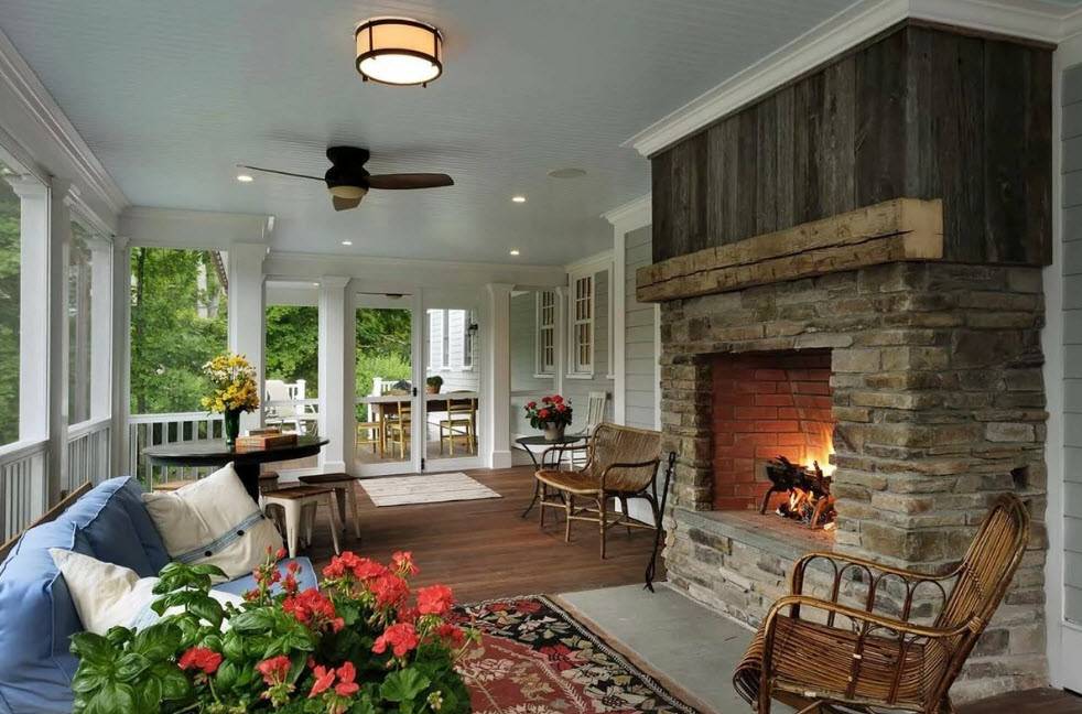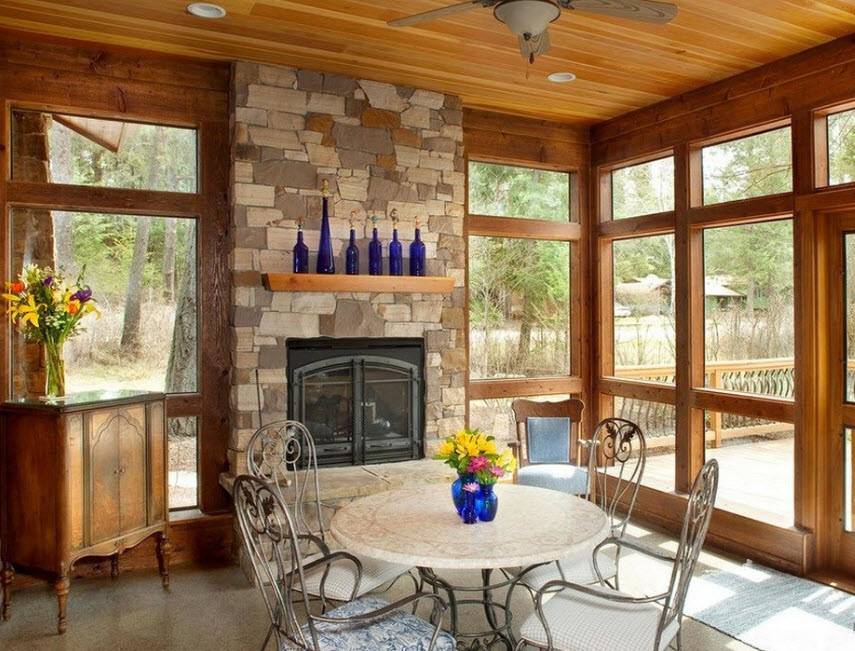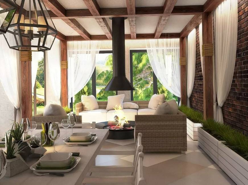Важно, чтобы стиль помещения соответствовал интерьер всего жилища. Сделать атмосферу более приятной и уютной поможет камин, который легко вписать в интерьер веранды