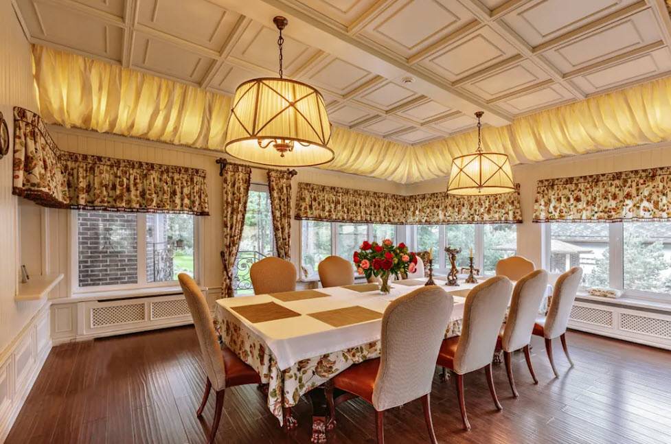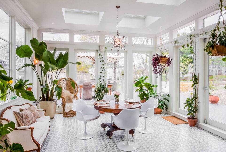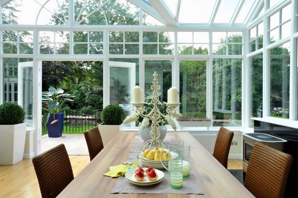 Веранда-столовая – уютная и дружелюбная комната с большими окнами, которая позволяет насладиться вкусной едой и красотой окружающей природы. Для оформления подходит стиль минимализм или прованс.