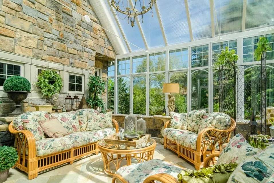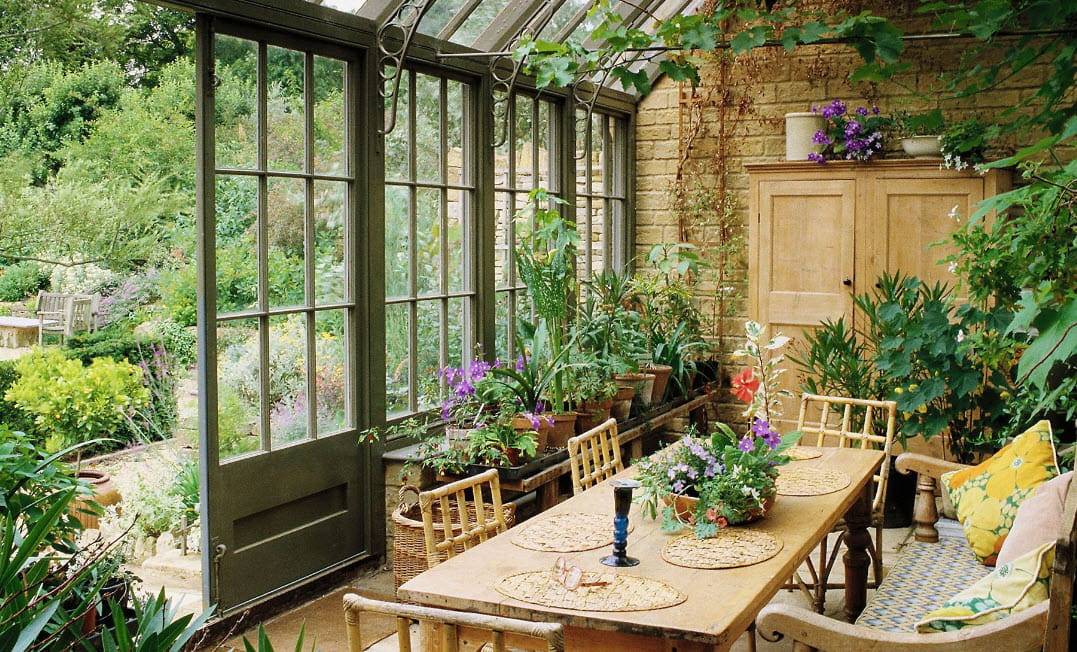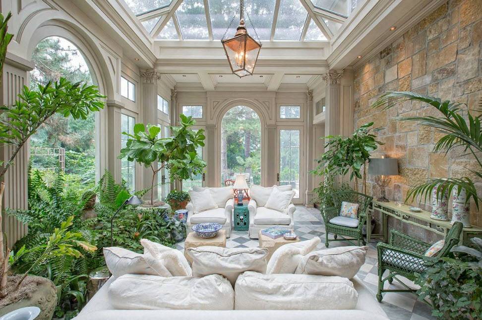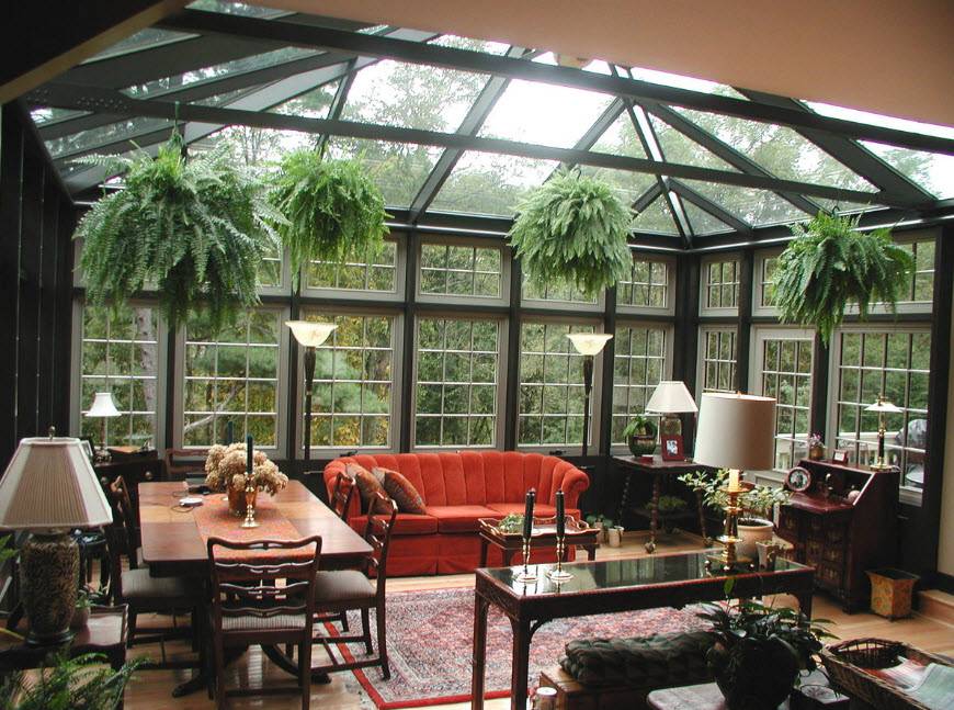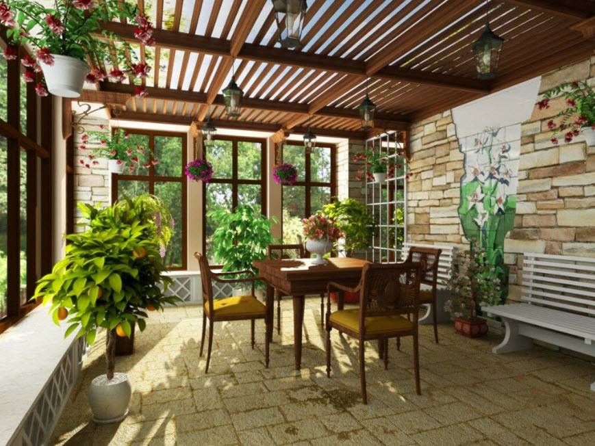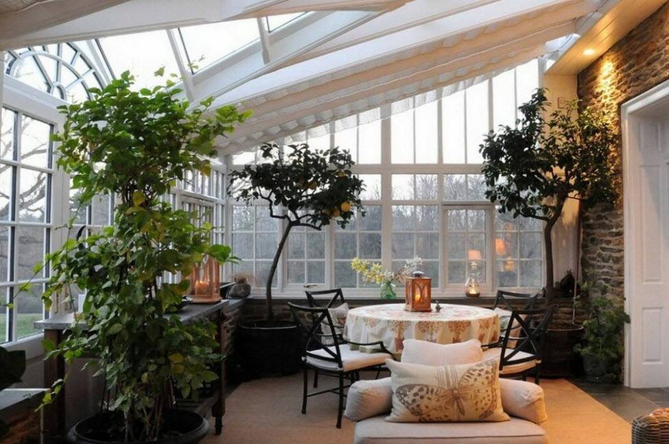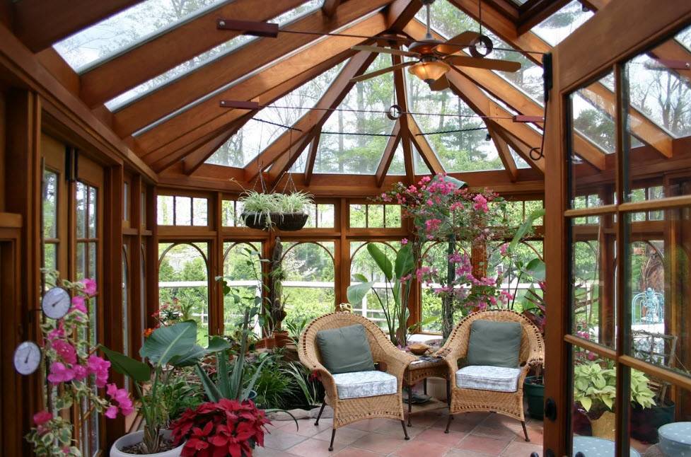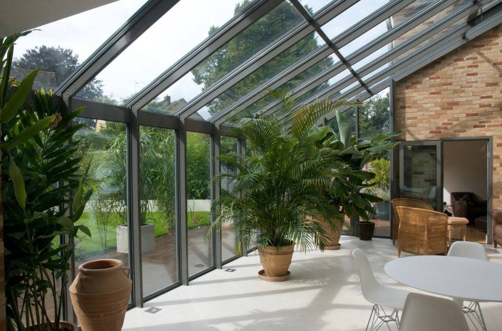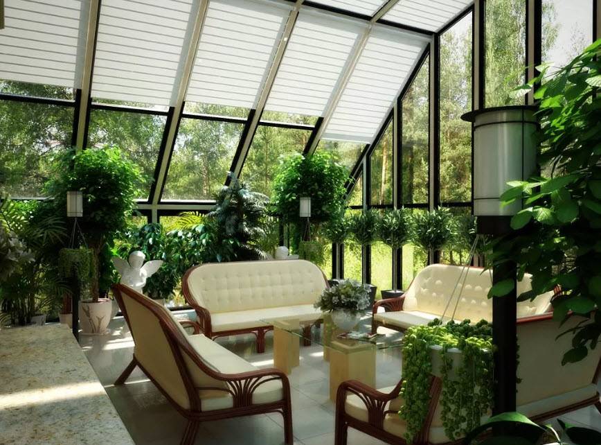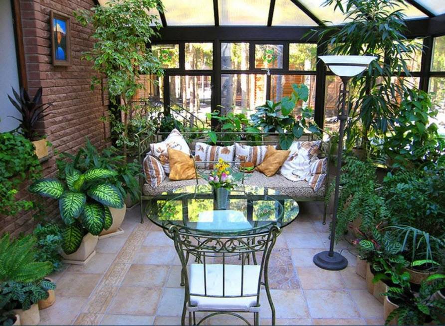 Зимний сад. Если частный дом достаточно большой, то на веранде можно заняться своим хобби, обустроив там оранжерею или зимний сад с обычными или тропическими растениями.