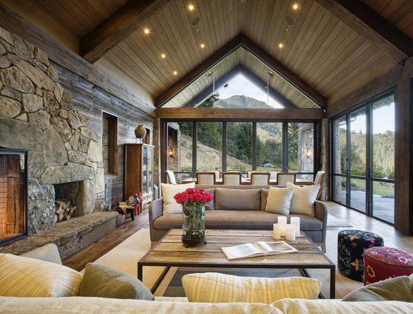 Камень можно задействовать при установке камина. Устройство станет источником тепла и изюминкой помещения. Пространство возле камина стоит дополнить каменной кладкой, чтобы все выглядело завершенным.