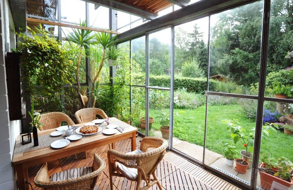 Пристройка веранды к дому может выполнять также полезные функции. На этом пространстве можно разместить любимые цветы и растения. Но такая терраса должна быть застеклённ. Рекомендуется поддерживать в помещении нужный микроклимат. При строительстве можно применить материалы, не боящиеся влажности.
