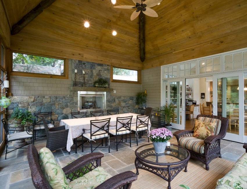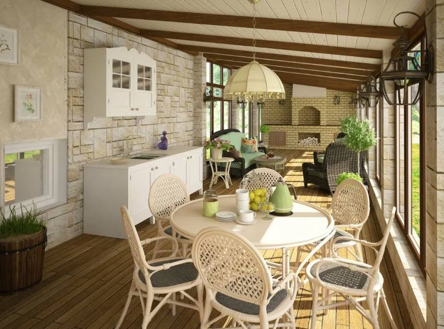 Если вы построите полностью закрытую веранду, то на ней можно устроить полноценное помещение для приема пищи, гостиную или кухню