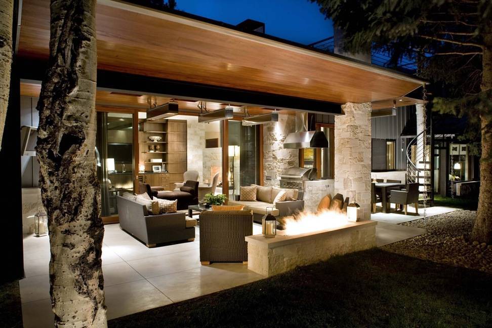 Камин уместен как на открытой террасе, так и в закрытой веранде