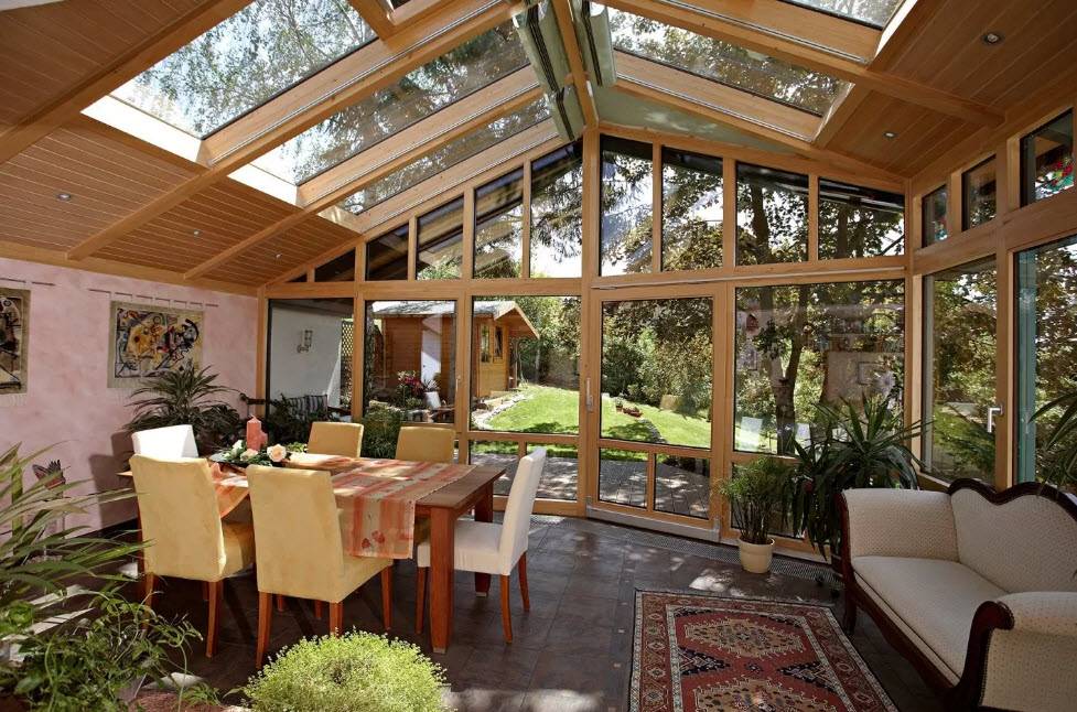 Стеклянная крыша веранды зрительно увеличивает размер помещения, придавая пристройке легкость и воздушность