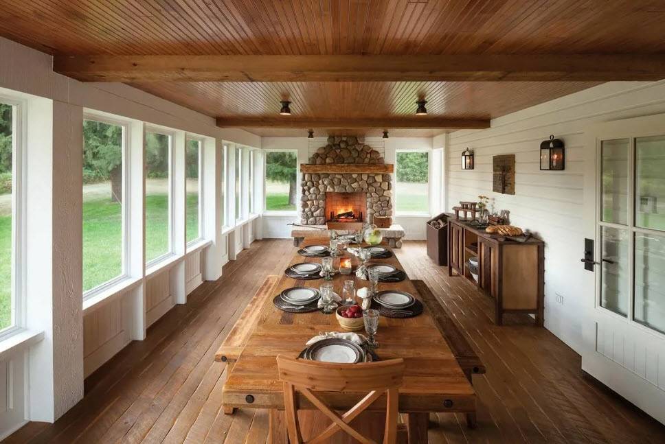 На таком виде веранды у дома потребуется размесить большой стол, добротные скамьи или стулья. Таким образом можно собрать на открытом воздухе всю семью или пригласить гостей