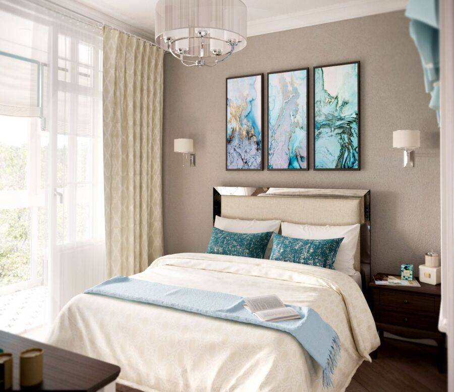 Причем сочетаться покрытие должно не только по цветовой гамме, но и форме. Например, для строгих прямых углов мебели в спальне в хрущевке подойдут обои с элементами геометрии или полосами.