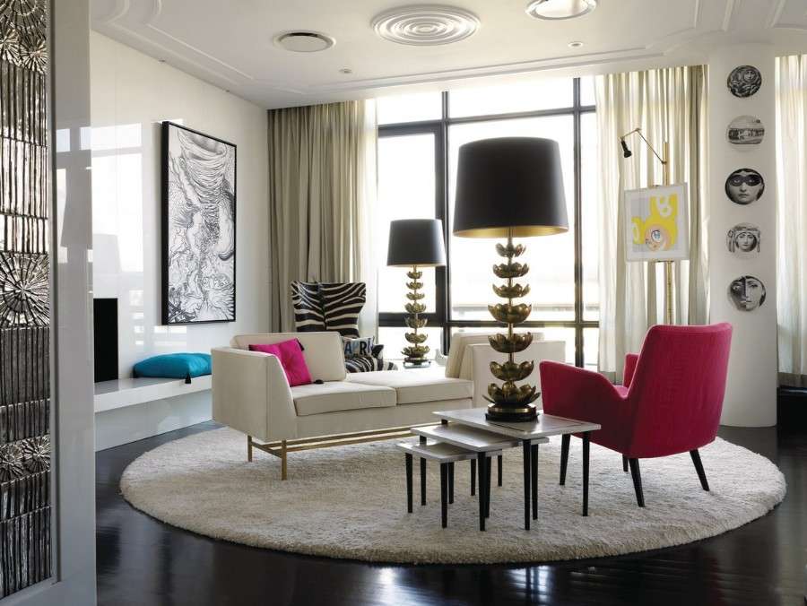 Одним из вариантов декора пола может быть ковёр. Небольшие яркие коврики играют роль цветового акцента в интерьере. Ковры побольше круглой или прямоугольной формы могут использоваться и для зонирования гостиной.
