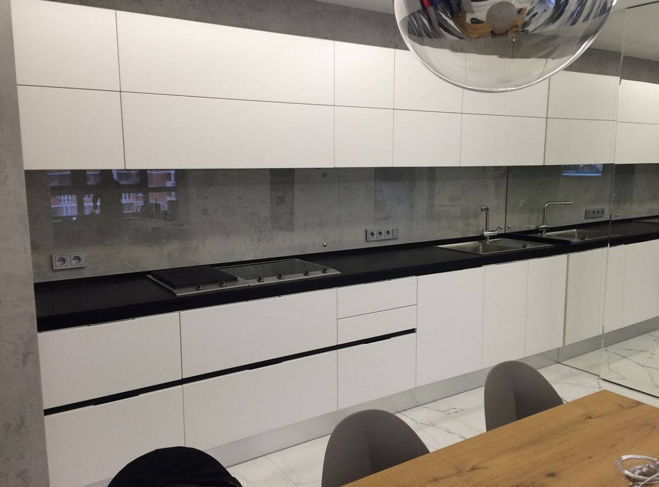 Очень часто фартук выполняется в том же ключе, что и столешница: тот же материал и текстура, идентичные мотивы. Различия могут быть в интенсивности цвета: на тон светлее или, наоборот, темнее. Белый вариант, как на фото ниже — в числе самых распространенных.