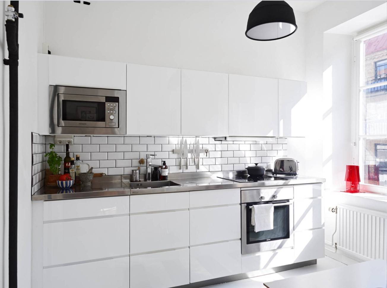 Белый кирпич, уложенный классически или елочкой, сделает помещение визуально более вытянутым и светлым, придаст дому современный вид. Белая столешница с таким соседством приобретет еще больше блеска.