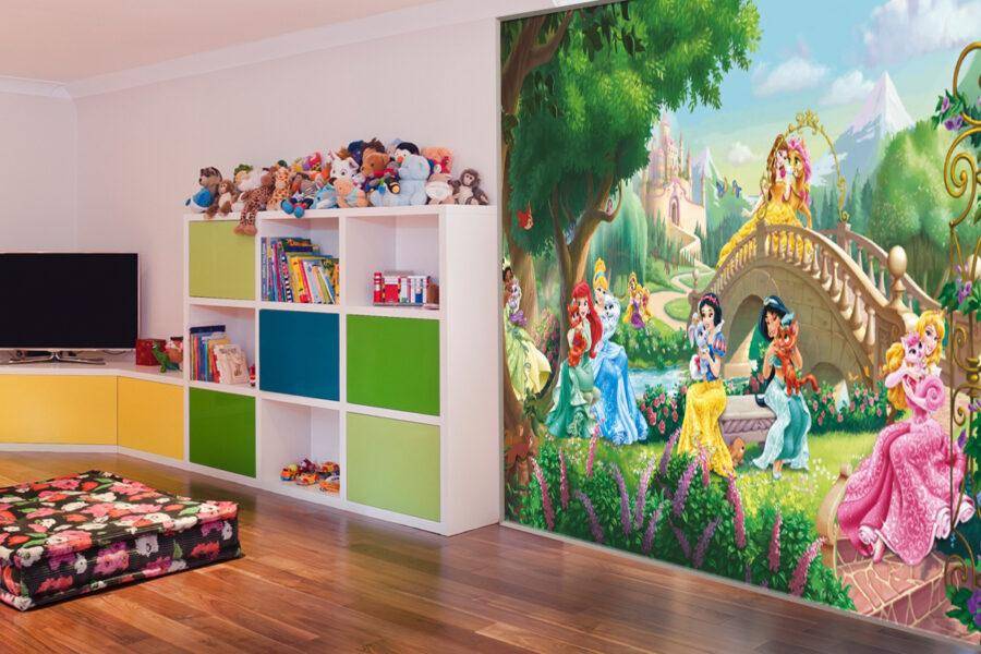 Помимо мягкой мебели и зоны отдыха, хорошим оформлением станут фотообои. Они не только помогут внести изюминку в интерьер, а и всячески будут способствовать развитию мимики, жестов, речи малыша. Если стены оформлены в сказочной тематике, то необходимо помнить, что малыш будет воспринимать увиденное, и это, несомненно, отложится в памяти. Можно стены оформлять сказочными героями или мультяшными персонажами в виде декораций.