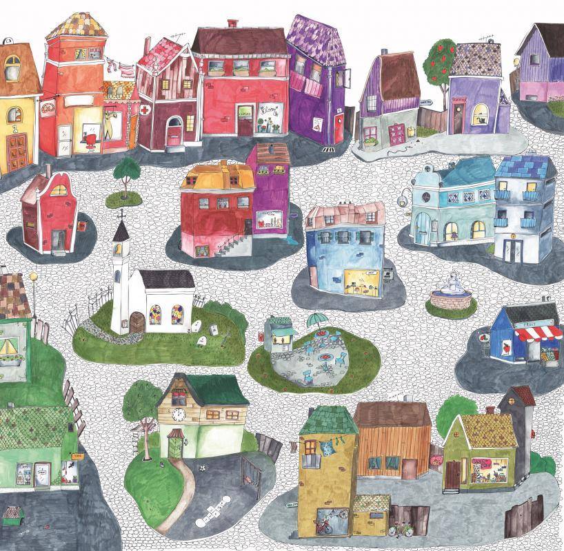 На фото торцевая стена небольшого зала оформлена фотообоями, на которых очень привлекательно смотрятся изображения ярких фасадов домов. Такой дизайнерский прием не оставит равнодушным ни одного гостя.