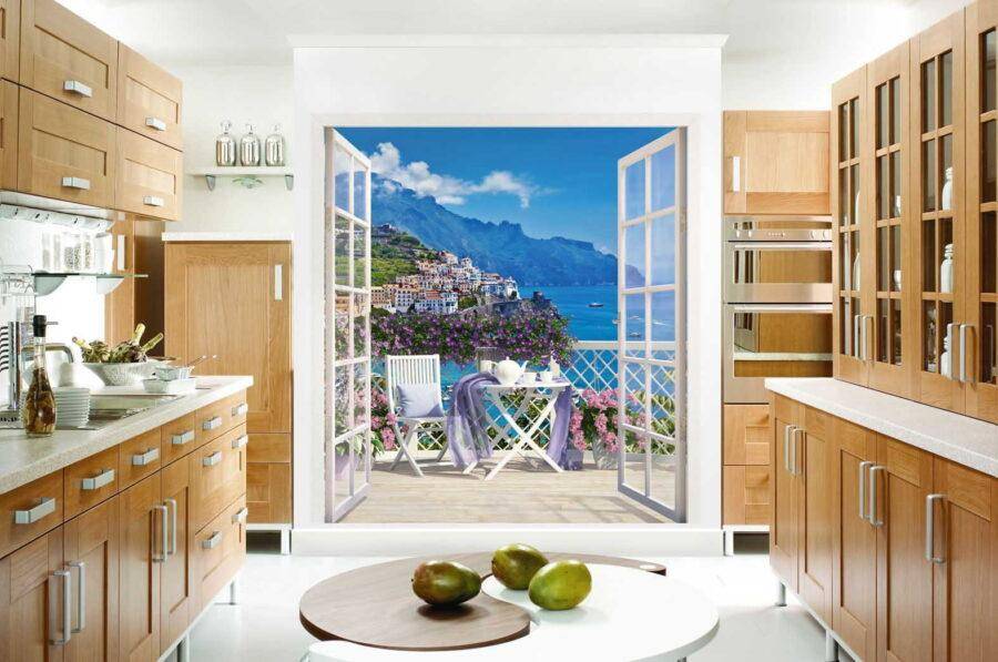 А вот так фотообои в интерьере кухни большой площади могут создавать эффект реалистичной иллюзии.