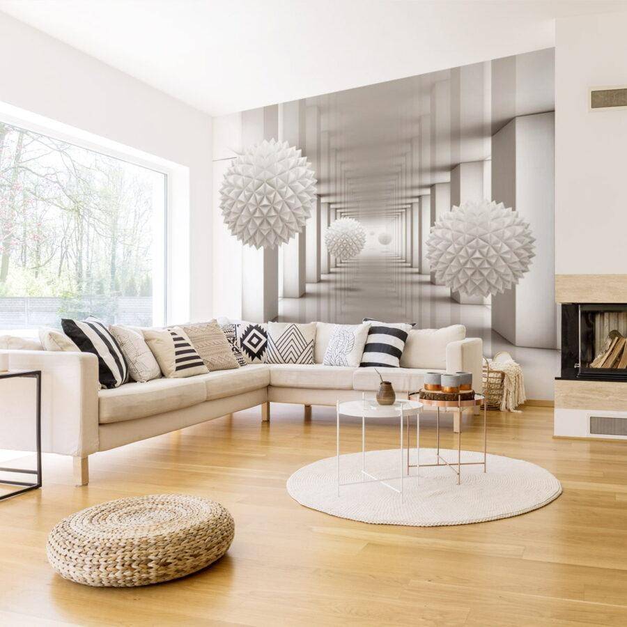 В дизайне гостиной с оригинальными фотообоями часто используют абстракции. Объемные картинки создают эффект движения или искривления пространства. Чтобы интерьер не выглядел крикливым, не стоит сочетать яркие шпалеры с пестрым оформлением.