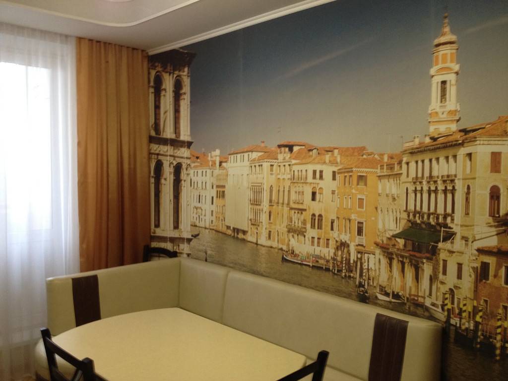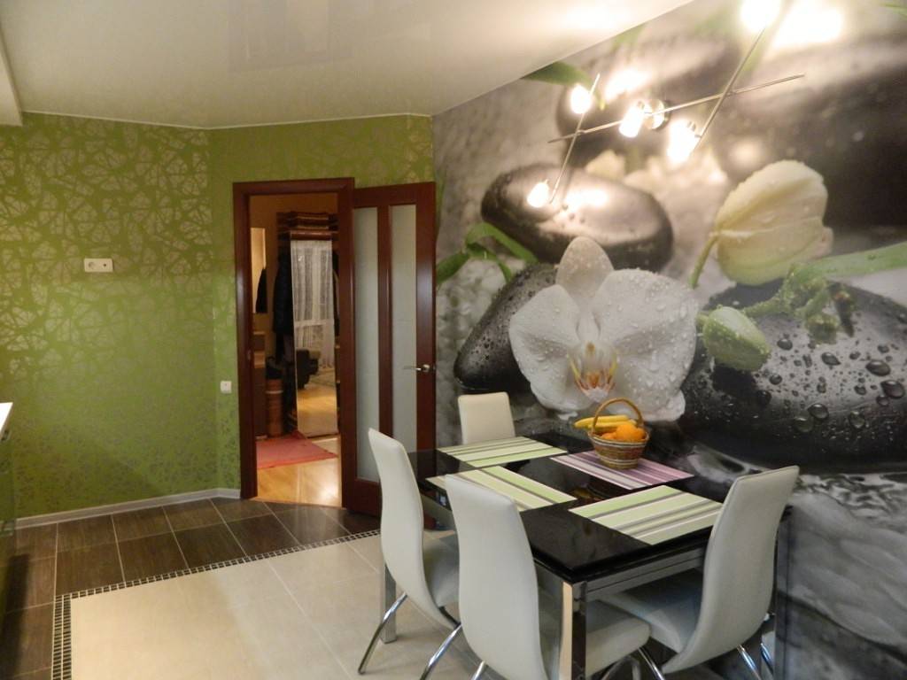 Для просторной большой кухни с полноценной столовой зоной, фотообои помогут выделить отдельные функциональные пространства – для приема пищи и для ее приготовления.