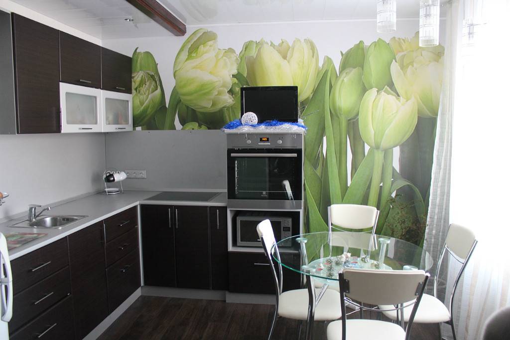 фотообои с изображением большого цветка сделают интерьер кухни более уютным
