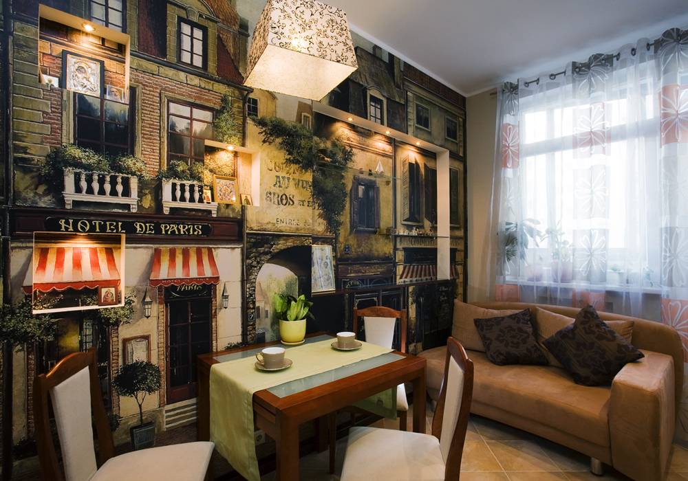 Мотивы для маленького помещения могут быть разными, желательно чтобы изображение способствовало эффекту раздвижения стен и стирало четкие границы. Хорошо с этим справится пейзажная или урбанистическая тематика, с уходящей вдаль перспективой, поклеенная на одной из стен по всей площади