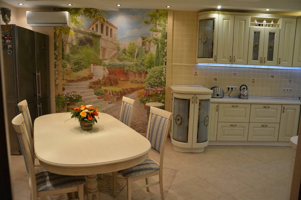 - Живописные полотна и фрески на стене подходят для классической кухни или столовой в исторической стилистике. Уместны и натюрморты на стенах.