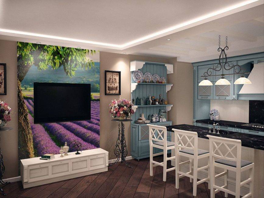 Для кухни, обустроенной в стиле прованс подойдет изображение открытой веранды в светло-пастельных тонах. Таких вариантов — множество, главное, не бояться проявлять собственную фантазию.