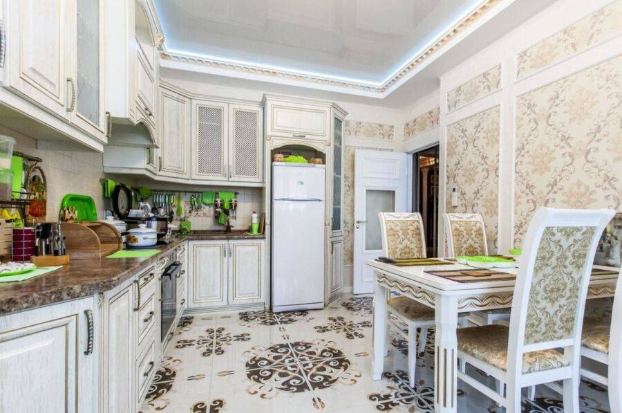 Роскошный вариант для просторного помещения. Если рядом ковры, мягкая мебель ─ сочетание выигрышное. А вот для рабочей зоны ─ это рискованный выбор. Декор требует исключительно сухой, аккуратной, даже нежной чистки, что трудно обеспечивается там, где работает плита, готовится пища.