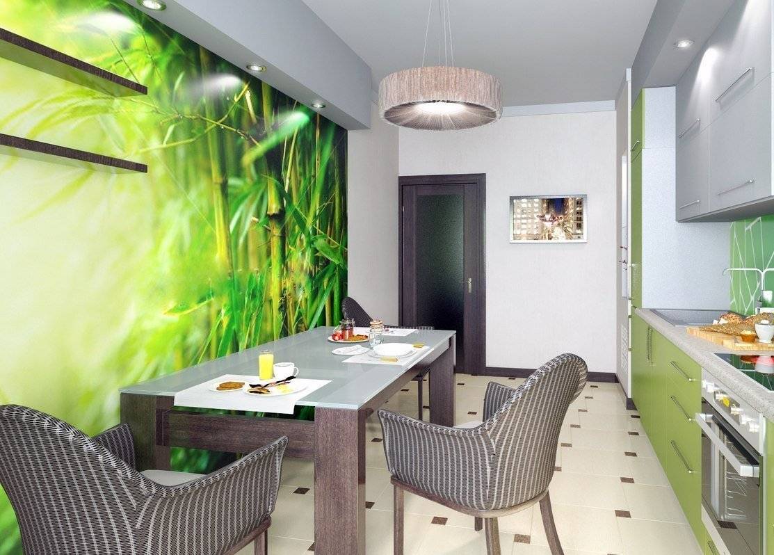 Для просторной большой кухни с полноценной столовой зоной, фотообои помогут выделить отдельные функциональные пространства – для приема пищи и для ее приготовления.