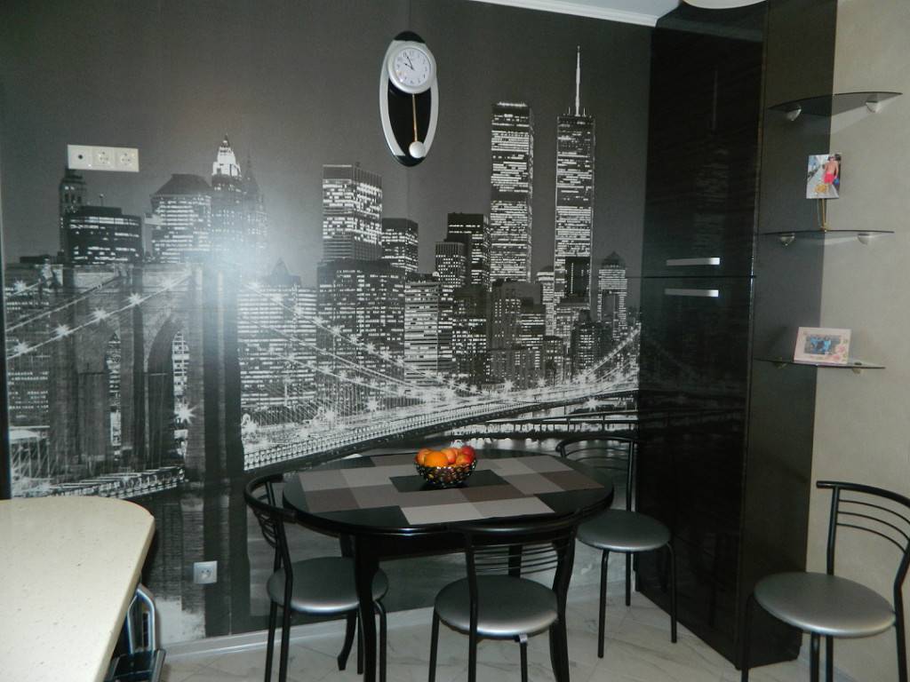 Выдержанные в черно-белом цвете фотообои подойдут для тех, чья кухонная мебель переливается всем цветами радуги.