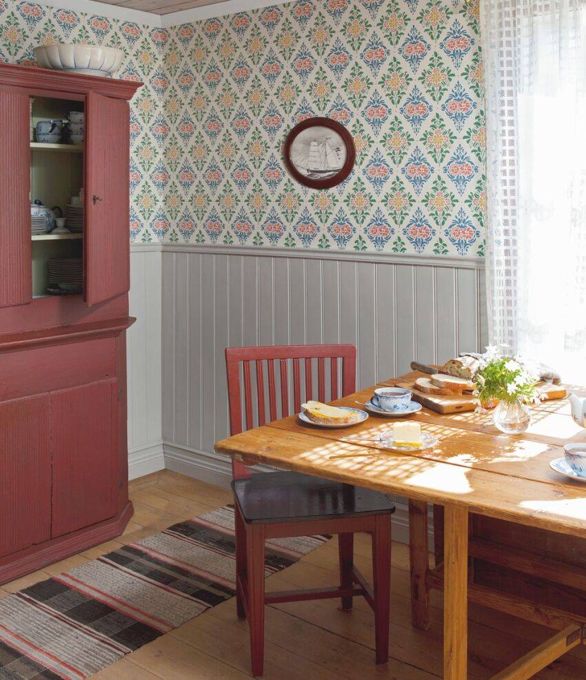 - Стены кухни могут быть оформлены обоями с растительными узорами, деревянными рейками или ровно оштукатурены.