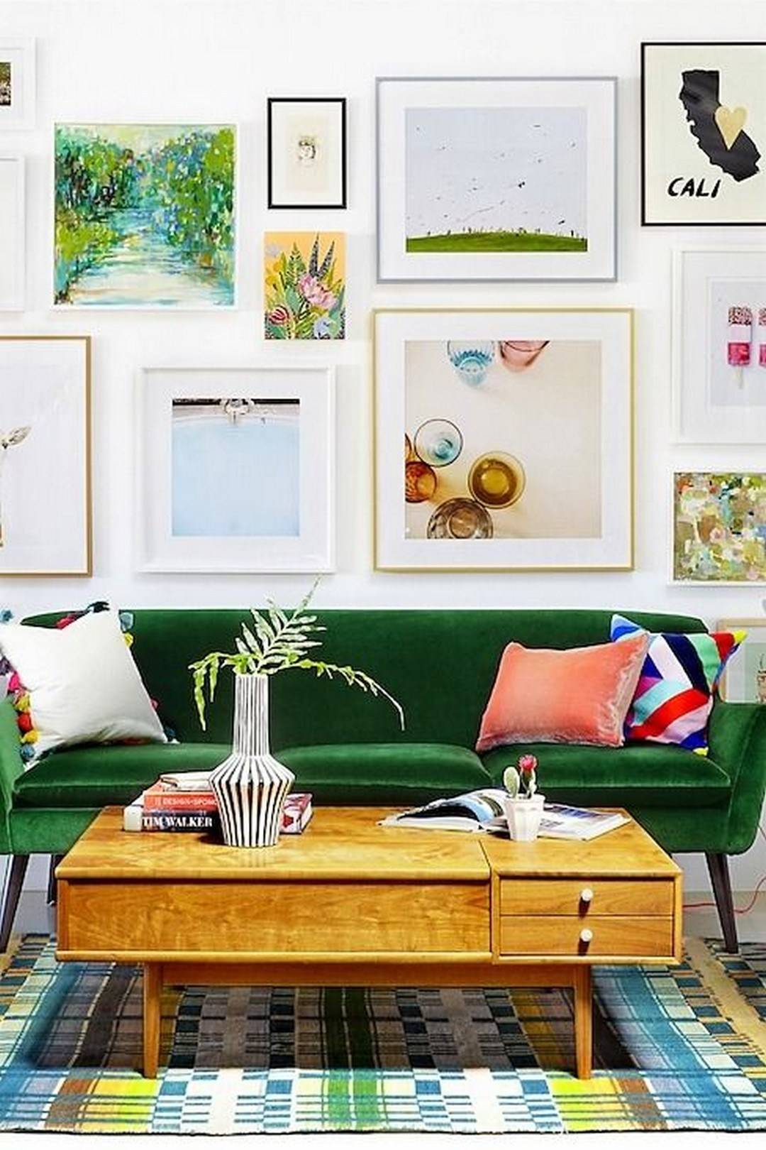 Хаотично размещенные фотографии и рамки разного размера украсят пространство над диваном в гостиной.