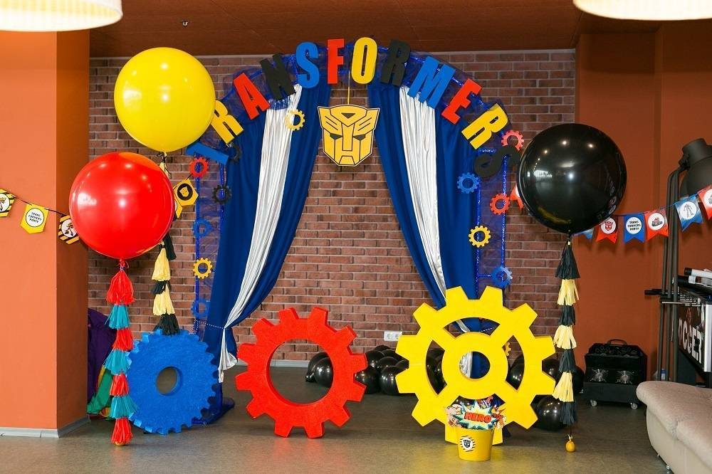 - Фон. Это то, что составляет основу. Фоном может служить распечатанный баннер с фотографиями, пожеланиями или любимыми героями. Может быть однотонная украшенная стена, рамка из цветов, красивая местность с кустами и деревьями или специальная конструкция из крепкого каркаса, на котором держится римская штора.