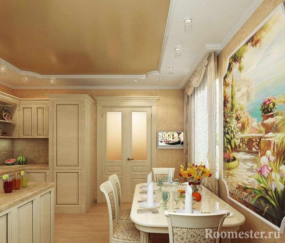 Для кухонного помещения фреска является редкостью, поскольку агрессивная среда отталкивает дизайнеров и владельцев от риска. Поверхность изделия должна быть крайне стойкой к любым воздействиям. Что касается вариантов декора, то здесь ограничений никаких нет. Это бывает как полная абстракция, так и тематический сюжет в тон интерьера. Часто встречается изображение французского кафе или провансальского домика на южном побережье. Сельская тематика хорошо сочетается со старинной технологией.