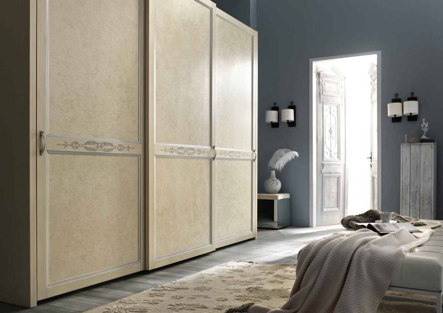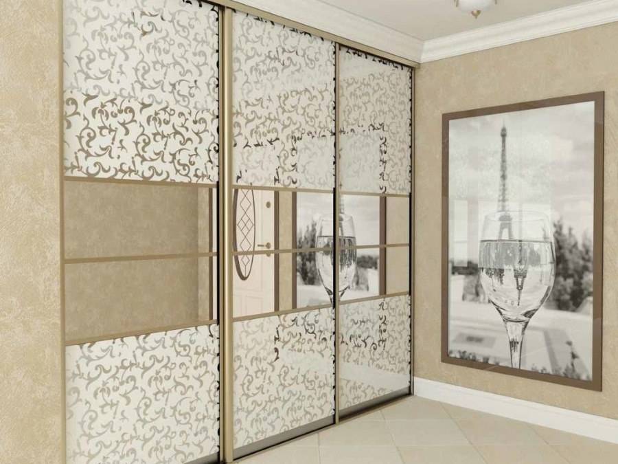 Шкафы со стеклянными дверцами. Свет от них позволяет визуально увеличить пространство. Во время примерки можно сразу, не отходя от шкафа, себя разглядывать. По краям зеркал в качестве украшений допустимы пескоструйные узоры.