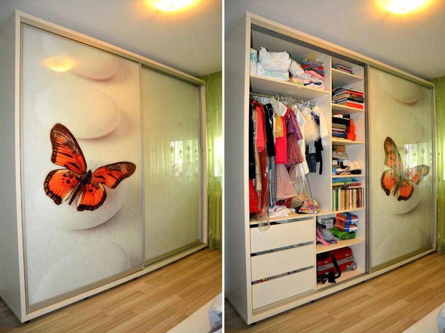Шкафы с фотопечатью. Технологии ее нанесения сейчас настолько продвинулись, что позволяют отобразить на поверхность любое фото или изображение, скачанное из интернета. Очень выручает, если дверцы шкафа выглядят громоздкими и создают эффект зрительного уменьшения пространства.