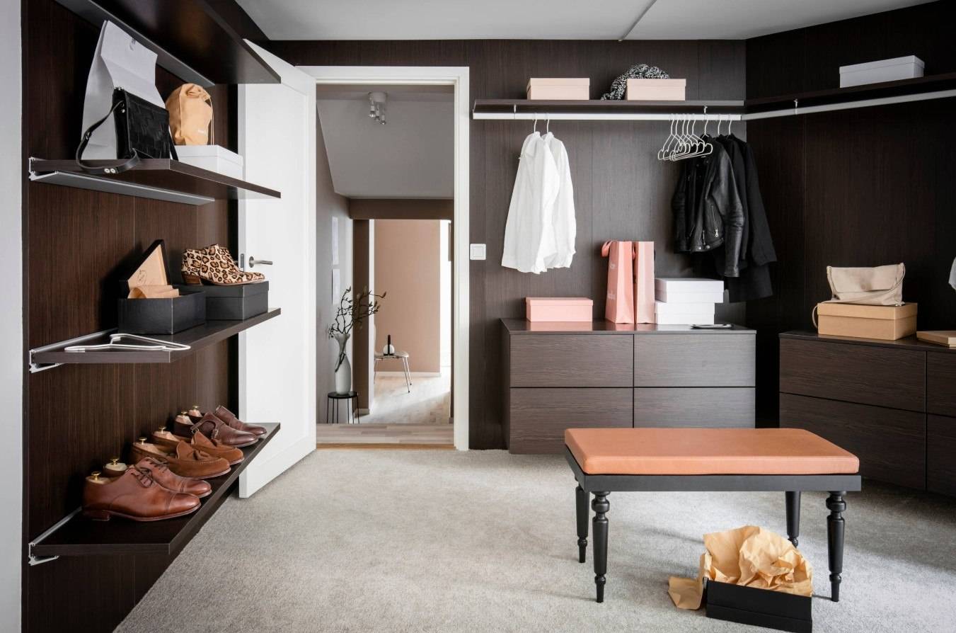 Для комфорта специалисты рекомендуют также расположить в гардеробной пуфик или небольшую скамейку.