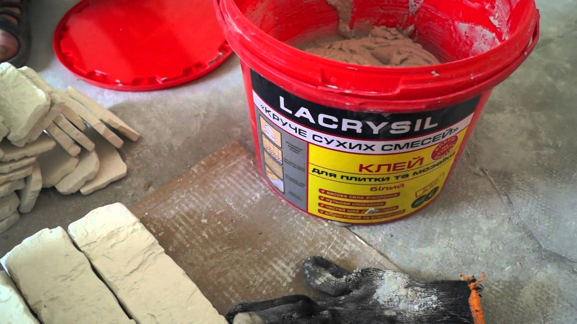Она начинается с подготовки клеевого состава. Для этого используют миксерную насадку для дрели. По консистенции клей должен напоминать сметану. Поверхность, на которую и будет наноситься гипсовая плитка, обрабатывается грунтовкой заранее, чтобы успеть высохнуть перед наклеиванием. Это нужно для лучшей адгезии с поверхностью.