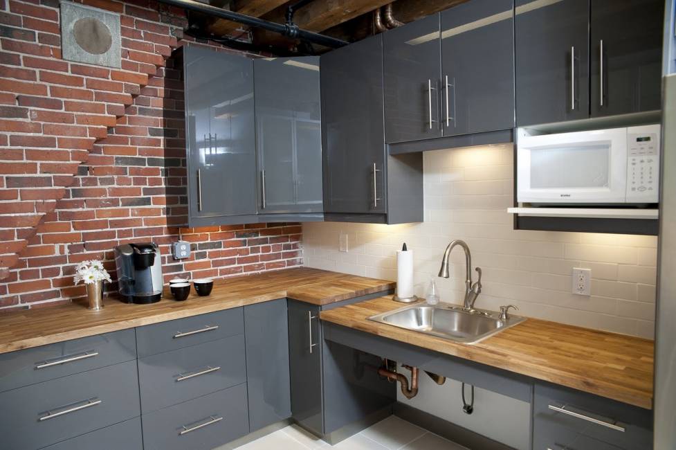 При взгляде на фото интерьера кухни синего цвета, оформленного в стилистике лофт, ни у кого не остаётся сомнений в том, что гарнитур богатого синего оттенка прекрасно дополняет бетонные полы и отделанные красным кирпичом стены.